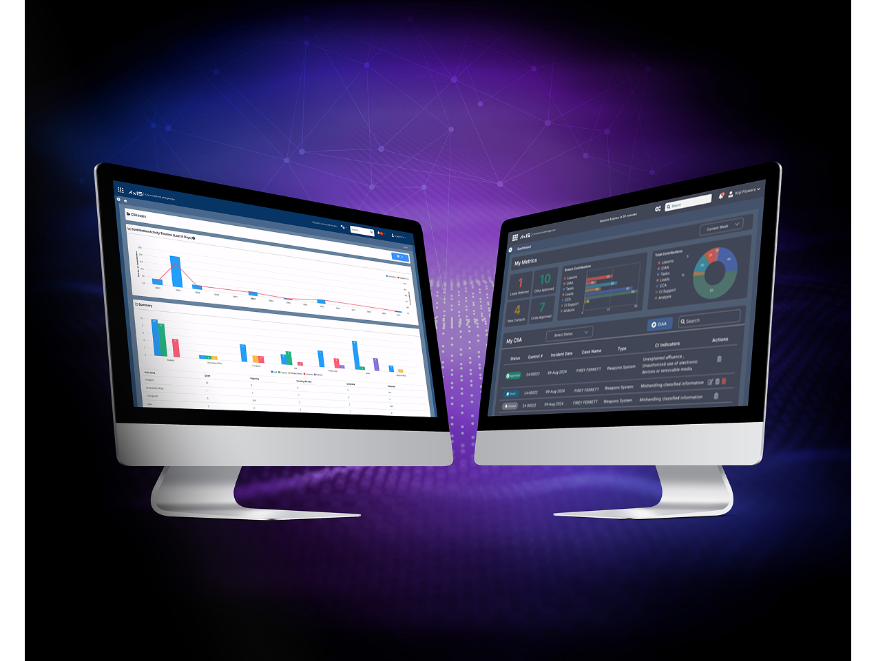 AxIS | Counterintelligence Mission Management, Execution, and Integration capabilities transform the CI MX. AxIS | Counterintelligence achieves this goal by delivering clear box mission transparency, streamlining the operational cycle, and unifying the mission through data, AI, and cross-platform integration.